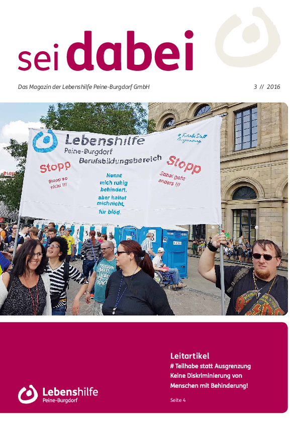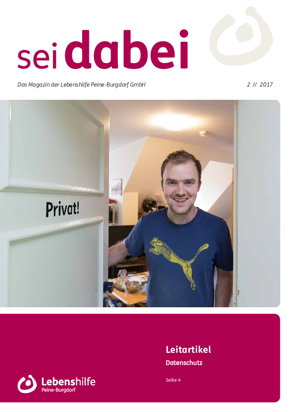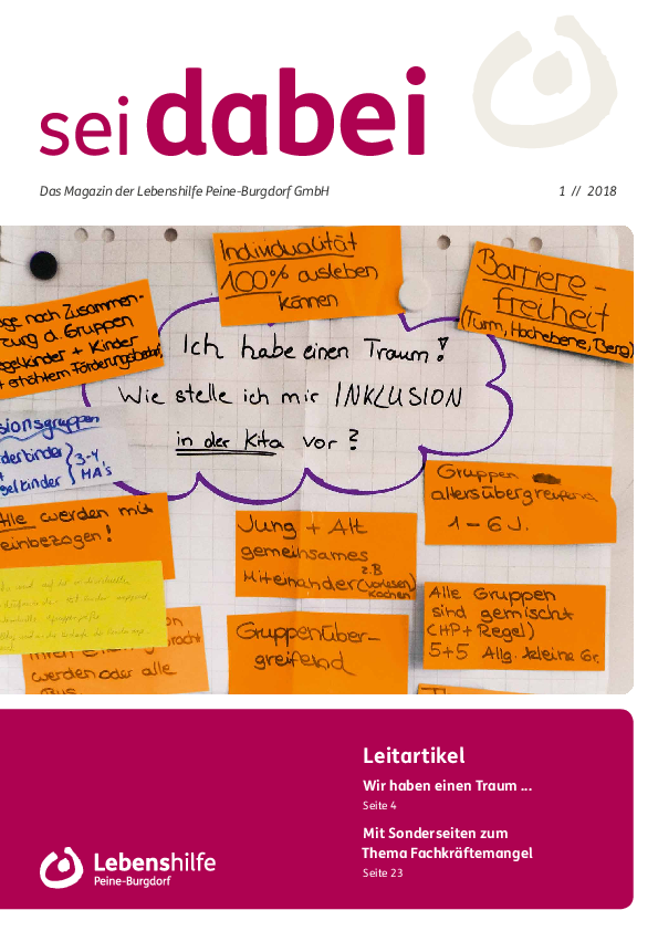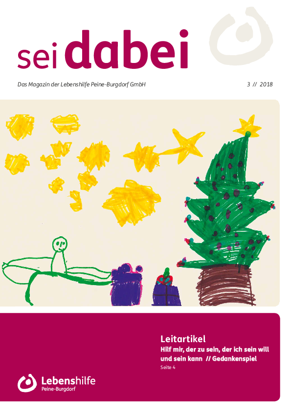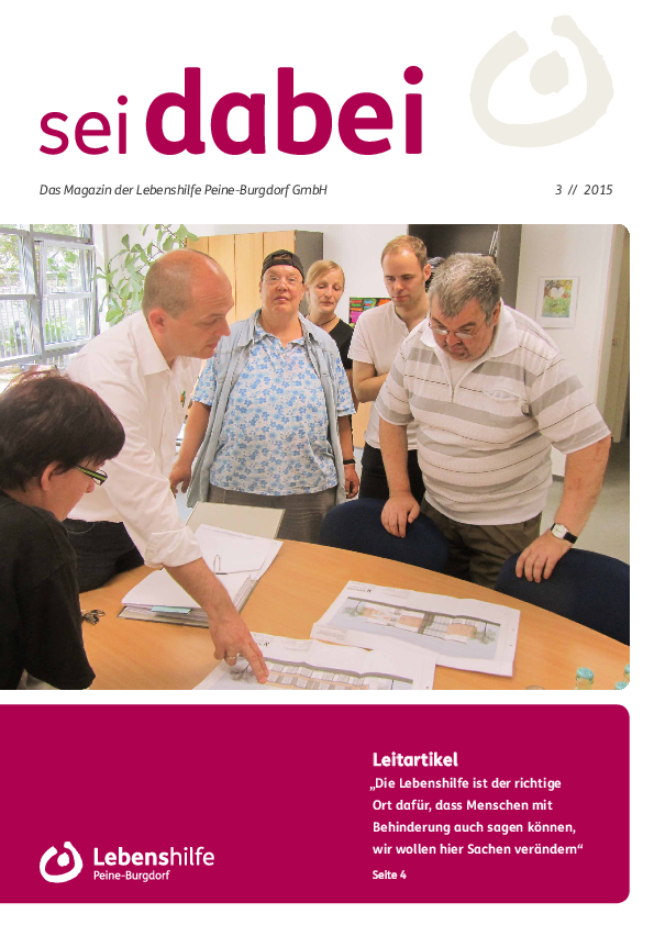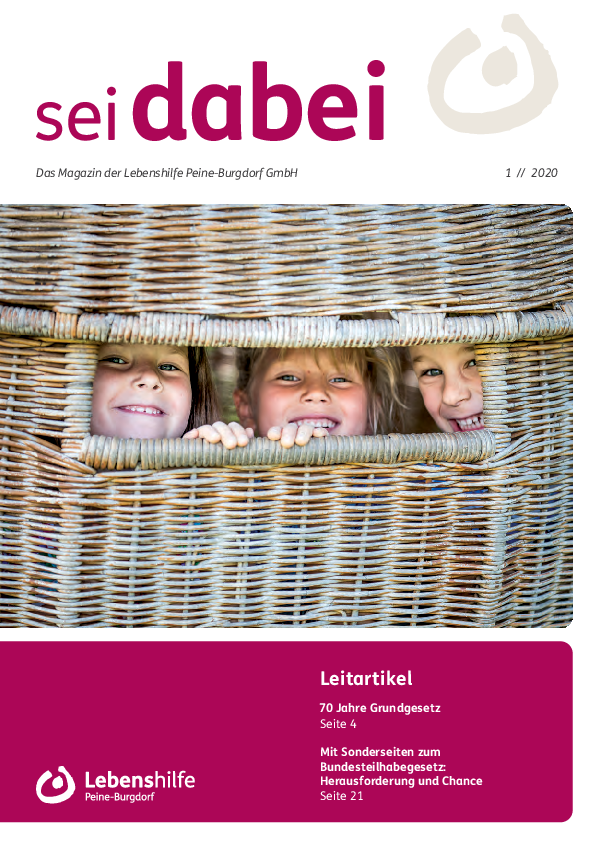 Mit unserem Magazin möchten wir Ihnen interessante Einblicke in unsere Arbeit gewähren. "sei dabei" soll außerdem Anregungen für eine inhaltliche Auseinandersetzung mit relevanten Themen geben – oder Ihnen einfach nur Freude beim Durchblättern machen. Manche Texte sind in Leichter Sprache, manche in Ausgangssprache geschrieben, ganz wie Sie mögen.